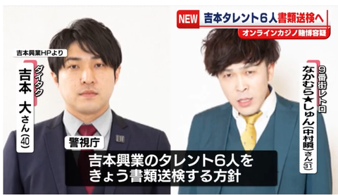吉本興業に所属するタレントがオンラインカジノをした疑いで、事情聴取を受けていた問題で、警視庁は、違法なオンラインカジノで賭博をした疑いが強まったとして、6人のタレントを3日にも書類送検する方針を固めたことが捜査関係者への取材でわかりました。 【図解】“違法”と気づきにくいワケ 「オンラインゲーム」と宣伝の広告も 警視庁が賭博の疑いで書類送検する方針を固めたのは、お笑いコンビ「ダイタク」の吉本大さん(40)、「9番街レトロ」のなかむら★しゅん(中村瞬)さん(31)ら、いずれも吉本興業に所属するお笑いタレント6人です。 この問題は、吉本興業に所属するタレントが、オンラインカジノをした疑いがあるという情報提供を受けた警視庁が、これまでに、タレント10人弱から任意で事情を聞くなど捜査を続けてきたもので、このうち6人について、賭博をした疑いが強まったということです。 捜査関係者によりますと6人は、2023年1月ごろから2024年12月ごろにかけて、日本国内から中米・オランダ領「キュラソー島」のライセンスを持つ、オンラインカジノサイト「スポーツベットアイオー」などにインターネット接続して、サイトで入金した上でスポーツベッティングなどの賭博をした疑いがもたれているということです。 吉本興業はこれまでに、任意の事情聴取を受けているタレントについて「最終的な処分等は、捜査の結果等を踏まえることになりますが、事実関係が確定し、様々な判断が決するまでは、関係各所及び本人とも協議の上、順次、芸能活動を自粛させていただいております」とコメントし、3月28日にはタレント向けにオンラインカジノの研修会を開いていました。 オンラインカジノを巡っては、警察庁のアンケートで、「日本国内でオンラインカジノを使用したことがある人」は、約337万人にのぼると推計され、そのうち現在も使用している人が推計約197万人とする調査結果が3月に公表されていました。 また、「違法と認識していなかった」と答えた人は、回答した7000人のうち、43.5%と半数近くにのぼり、オンラインカジノに対する違法性の認識の低さが、浮き彫りになっています。 オンラインカジノは、海外では合法的に運営されていたとしても、日本国内からアクセスし賭博をすることは違法ですが、インターネット上では、「海外で合法的に運営している」とうたう広告や、「日本では取り締まる法律がない」などという誤った情報が出回り、違法と知らずにアクセスしてしまうケースが多く確認されています。 今回書類送検されるタレントが使用していた「スポーツベットアイオー」についても、日本語のサイトがある一方で日本国内からの使用を禁止する記載等はないということです。 警視庁は「オンラインカジノは違法なだけでなく、依存症になる恐れもあるので使用しないでほしい」とした上で、「メンタルケアなどもしていきたい」としています。